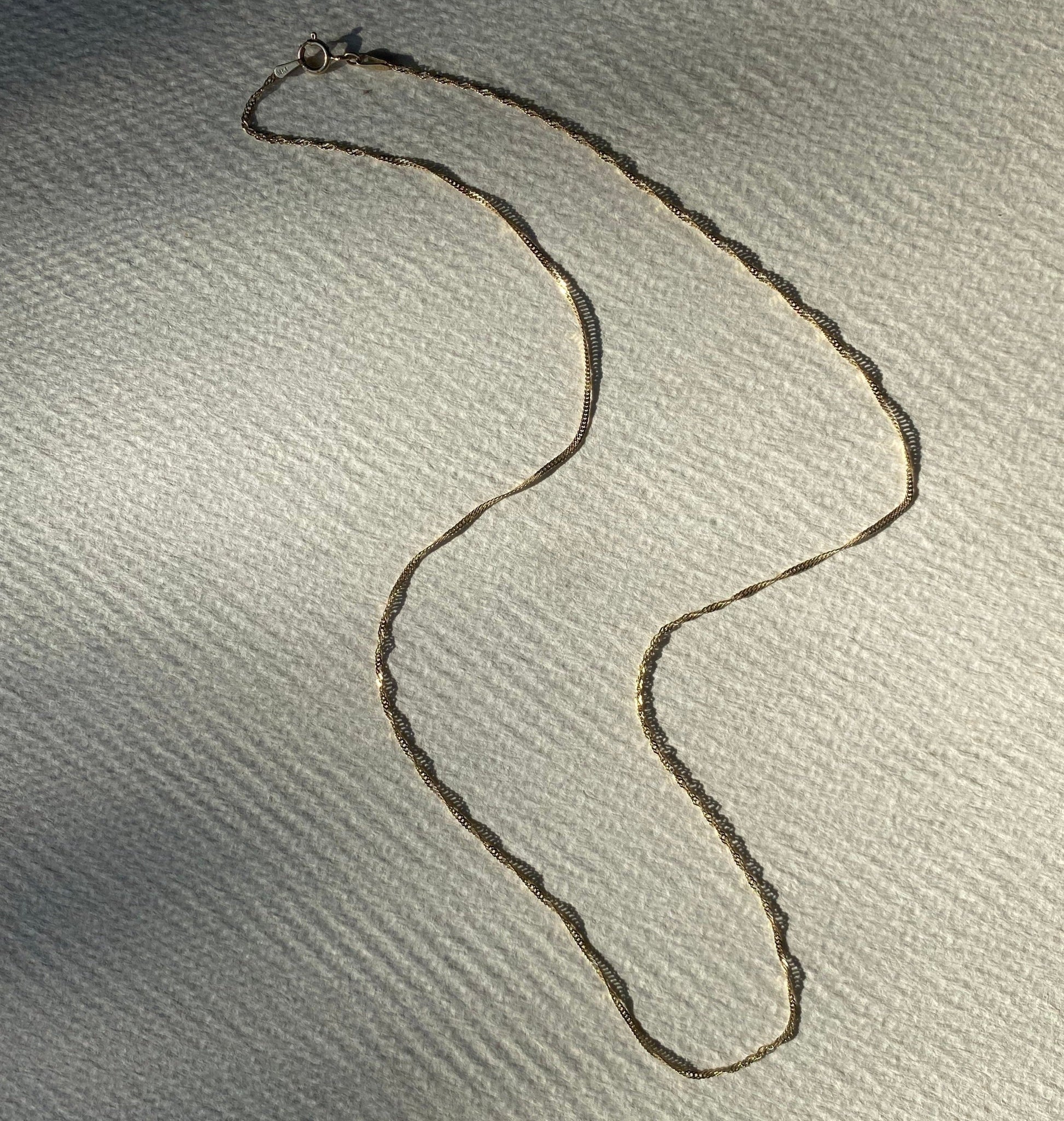 Cadena delicada y favorecedora para uso diario con la cantidad perfecta de movimiento y brillo. Llévala sola o ponle tu dije favorito. Diseño liviano y delicado con trenzado/cuerda.