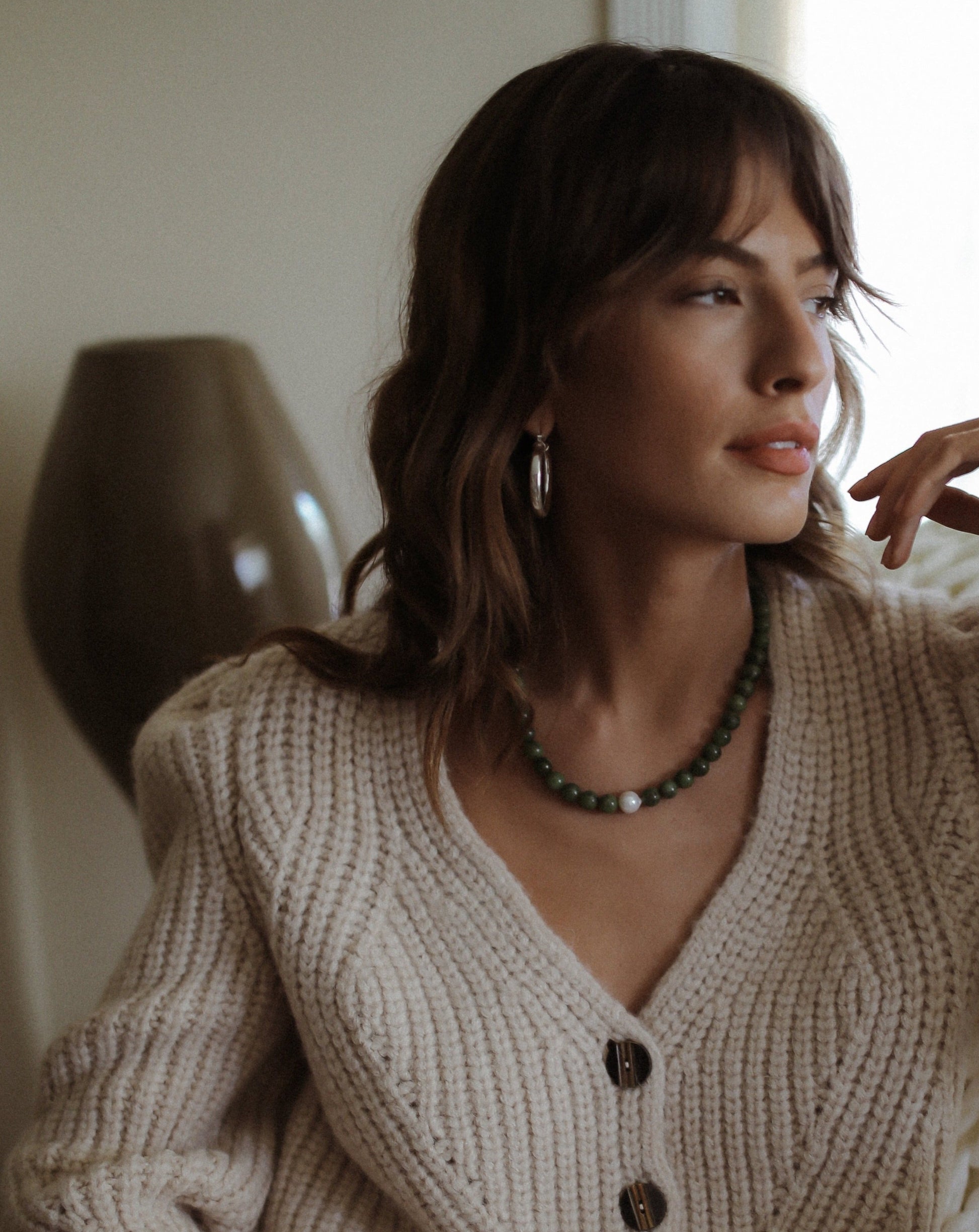 Cuentas de jade verde con una perla barroca de agua dulce asimétrica.