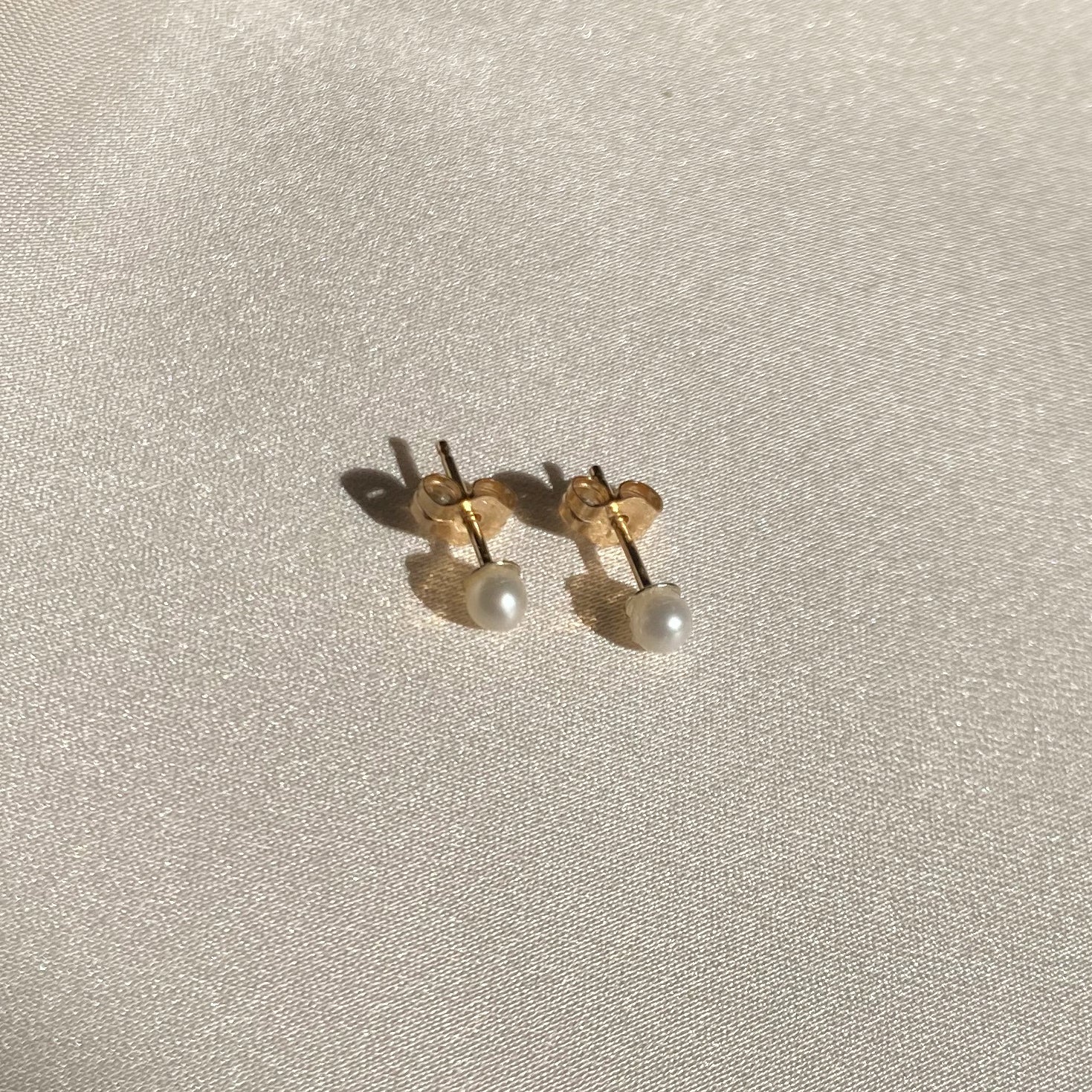 Pequeños pendientes con auténticas perlas de agua dulce sobre postes rellenos de oro de 14 quilates.