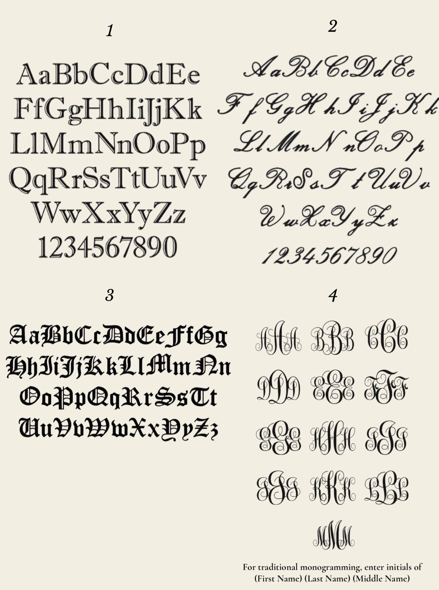Casi cualquier fuente o grabado está disponible: envíe un correo electrónico a hello@brennan-studios.com con su solicitud personalizada.