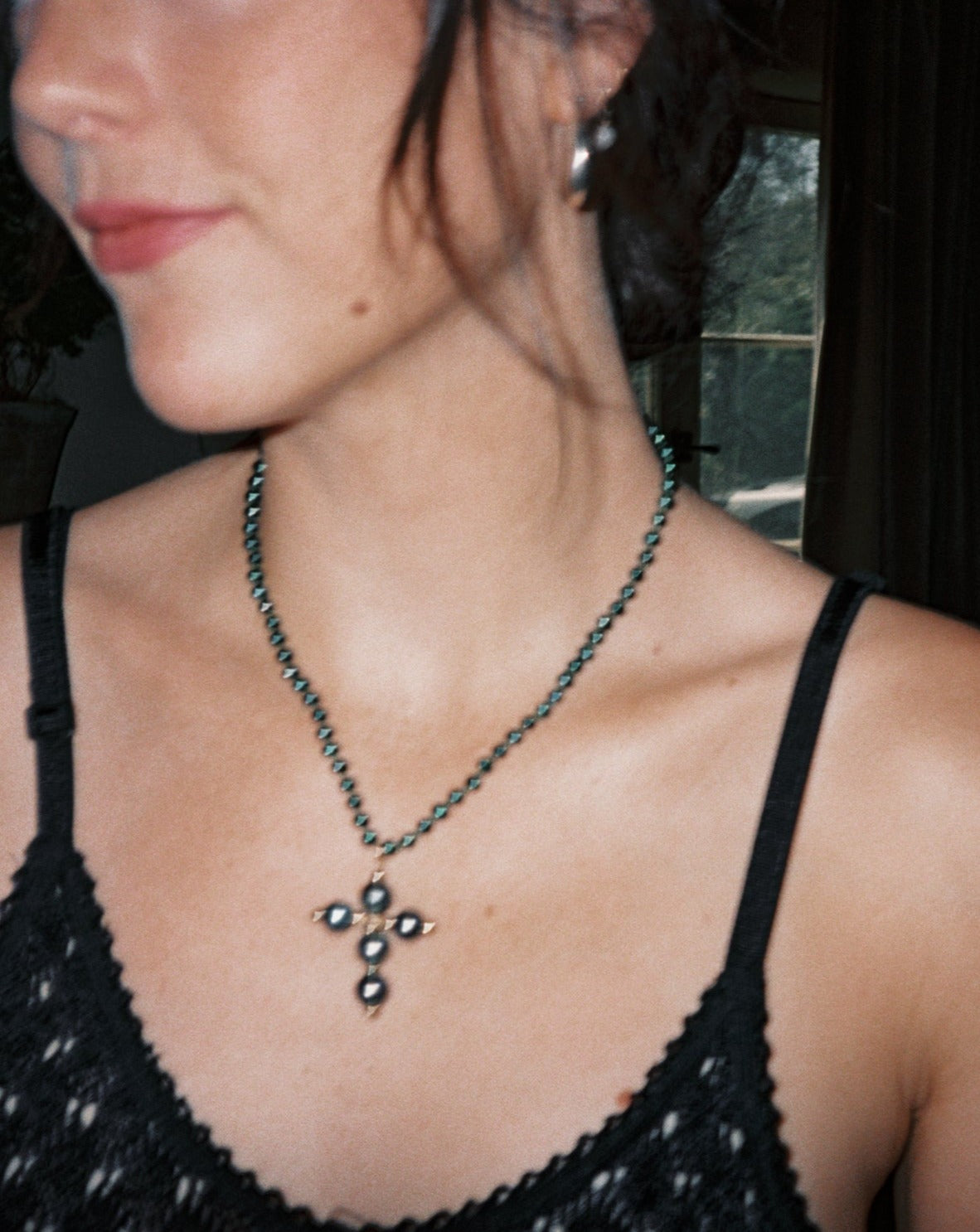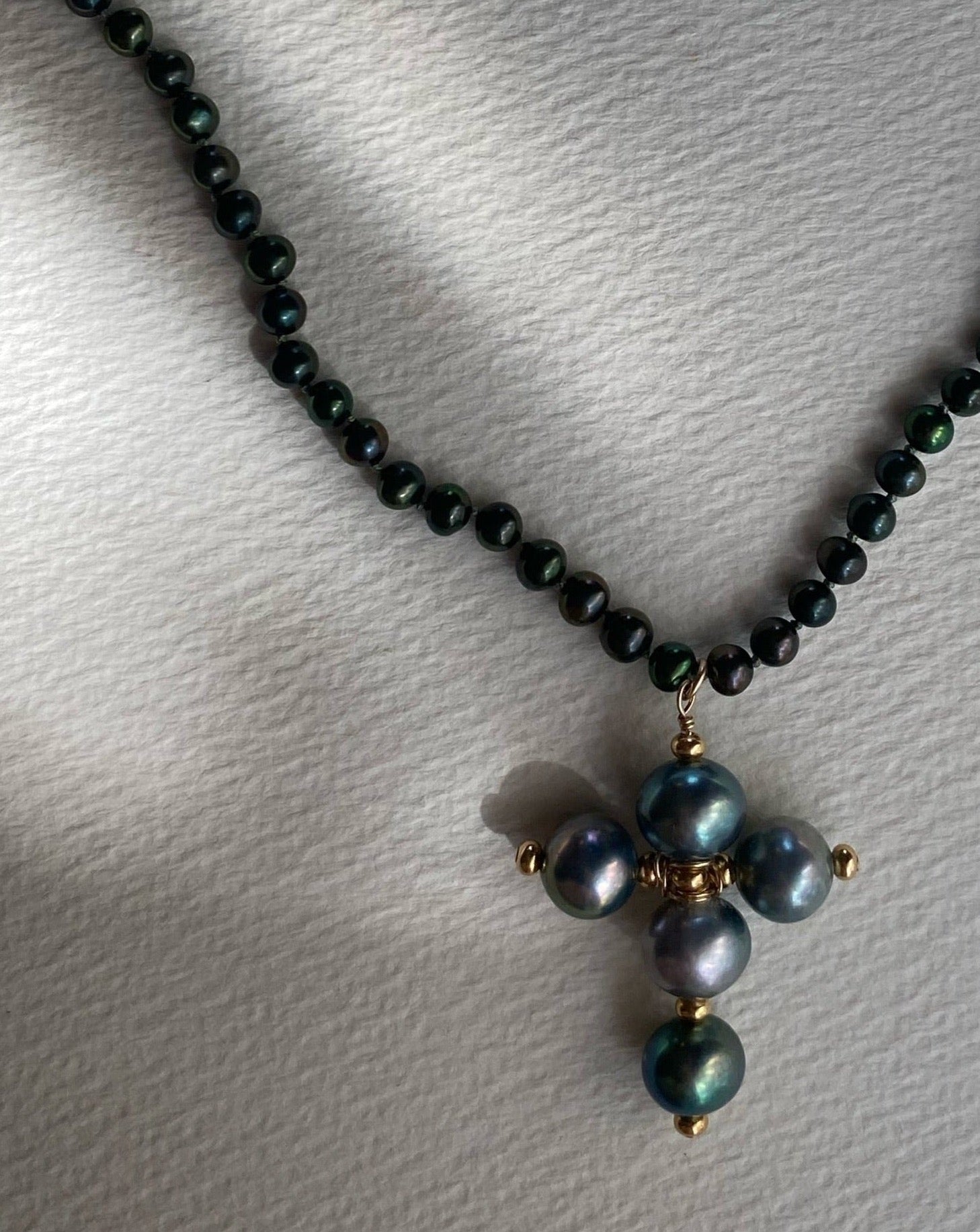 Perlas negras iridiscentes de agua dulce con detalles rellenos de oro de 14 quilates.