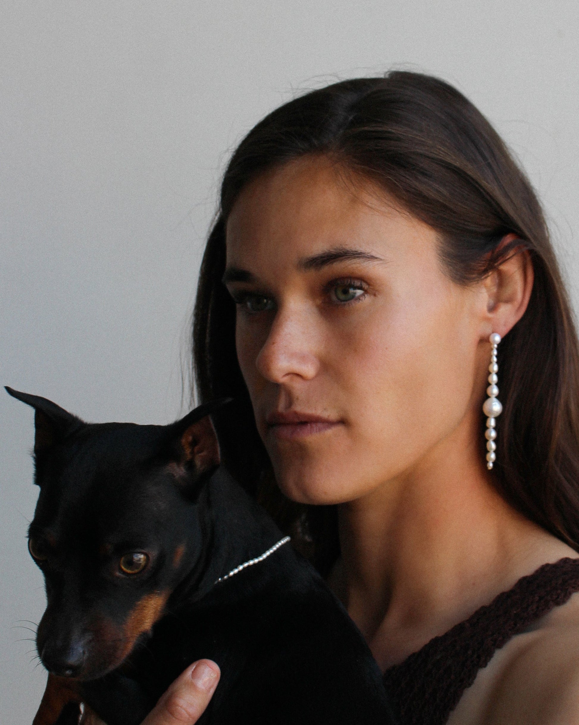 Luminous freshwater pearls suspended in orbit, echoing molecular forms and the fluidity of water droplets. The detachable drops can be removed, leaving you with a freshwater pearl stud, or worn in front or behind the ear, or slipped on a enhancer and chain and worn as a pendant—versatile and ever-shifting.