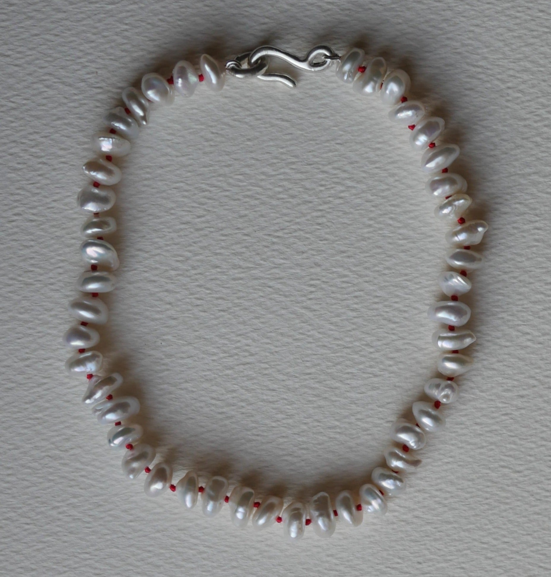 Perlas de agua dulce ensartadas en seda roja con un cierre de ojo de pez hecho a mano.