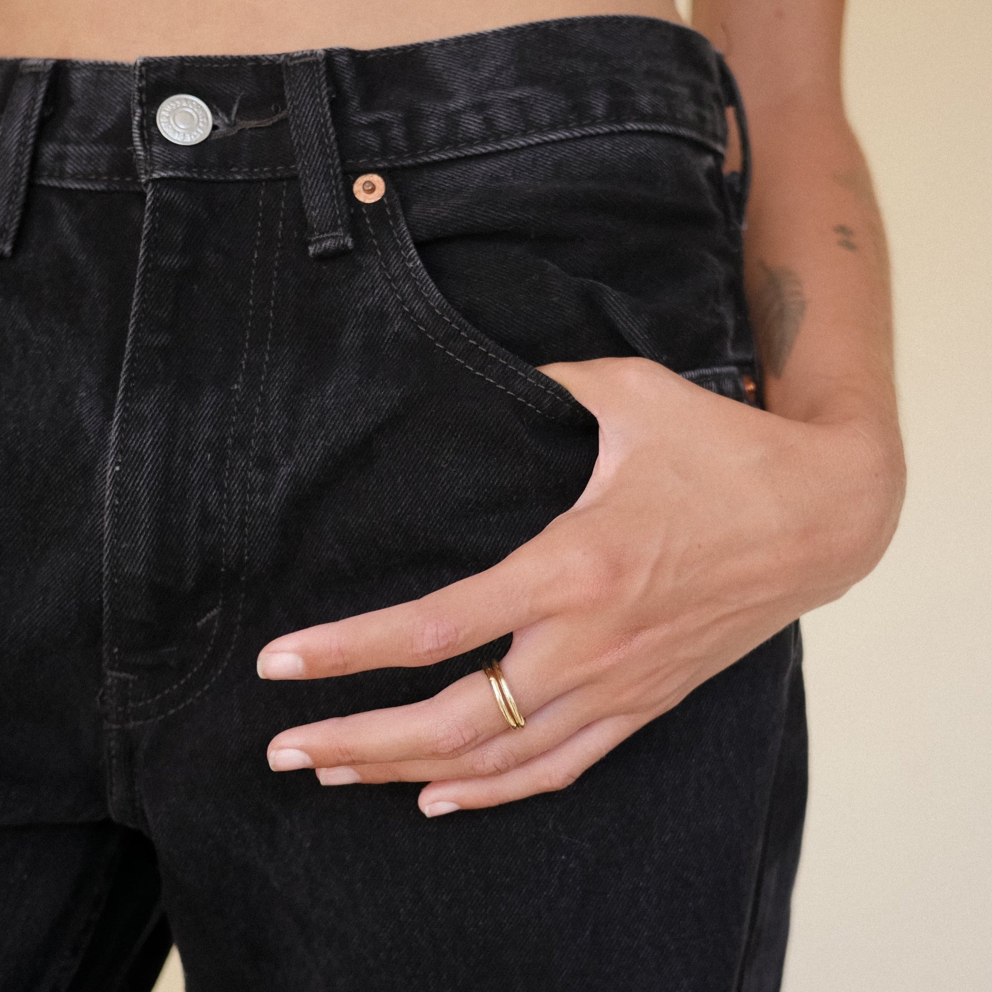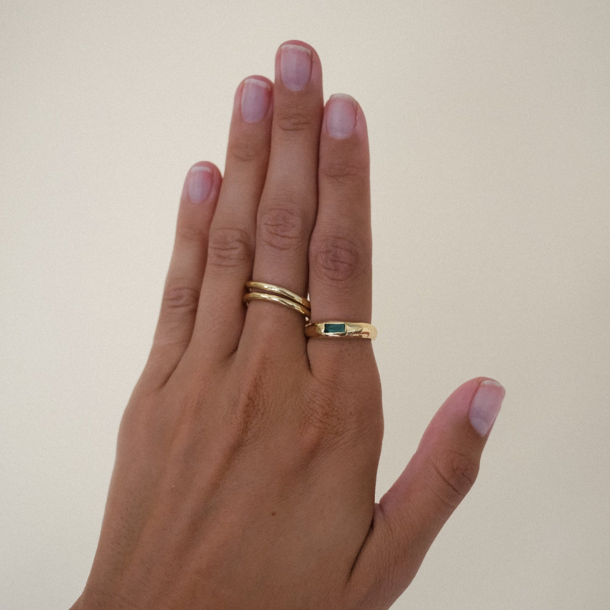 El imprescindible para siempre. Hecho a mano en oro macizo para lucir todo el día, todos los días. Llévalo solo o coleccionalos para combinarlos. En la foto, con el anillo Wabi (esmeralda baguette)